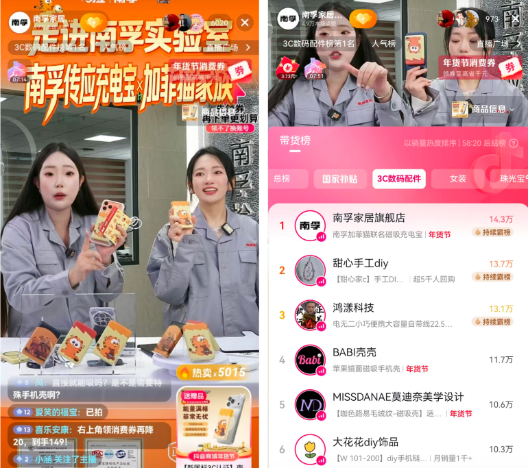 以「南孚传应」为例,商家避开参数混战,将直播间搬进通过CNAS认证的自有实验室,以硬核溯源关联“春节安心团圆”的安全感,并结合加菲猫家族联名IP打造“高能懒猫陪你守岁”的温情场景,将性能指标转化为精致妈妈人群可感知的陪伴价值。